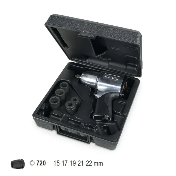Omschakelbare slagmoersleutel, gemaakt van aluminium, geleverd met 5 slagdoppen, in koffer