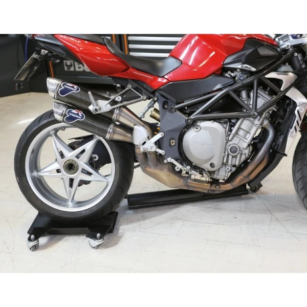 Verrijdbare centrale motorenstandaard of op het motorfiets achterwiel met verlenging voor zijstandaard