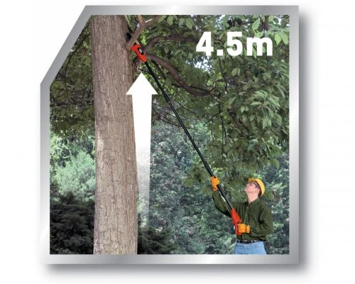 - Telescopische steel. Instelbare werklengte van circa 2 tot 3 meter, zodat takken tot een hoogte van 4,5 meter kunnen worden gesnoeid