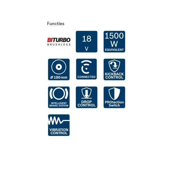 - BITURBO Brushless-technologie voor snel doorslijpen van diverse materialen zoals metaal, beton, bakstenen en tegels