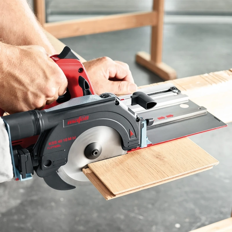 - Door de snelsluiting kan de machine snel en eenvoudig van de liniaal genomen worden. Hierdoor is de machine ook inzetbaar als aparte handcirkelzaag, met alle functies die u ook bij de K-handcirkelzagenserie van MAFELL vindt.