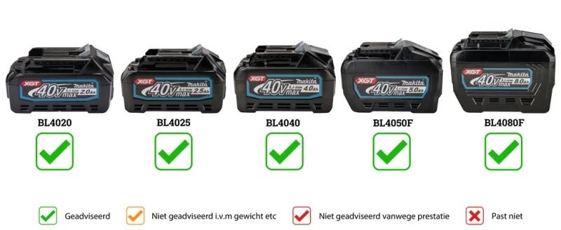 - Werkt op XGT 40 V Max accu, LXT 18 V accu, 230 V netstroom of via een 12 V of 24 V aansluiting.