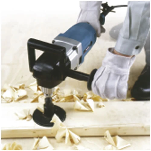 Misschien wel de enige machine om veilig de grootste gaten te boren met een volboor of met een gatenzaag voor dakdoorvoeren of PVC buizen. Veilig omdat door de haakse hefboomvorm de machine altijd muurvast in de hand kan worden gehouden. En dat is nodig bij deze brute krachtpatser, die daarom voorzien is van een (veiligheids)slipkoppeling op de lage toerenstand. De verdraaibare achterhandgreep geeft superieure grip bij elke houding.