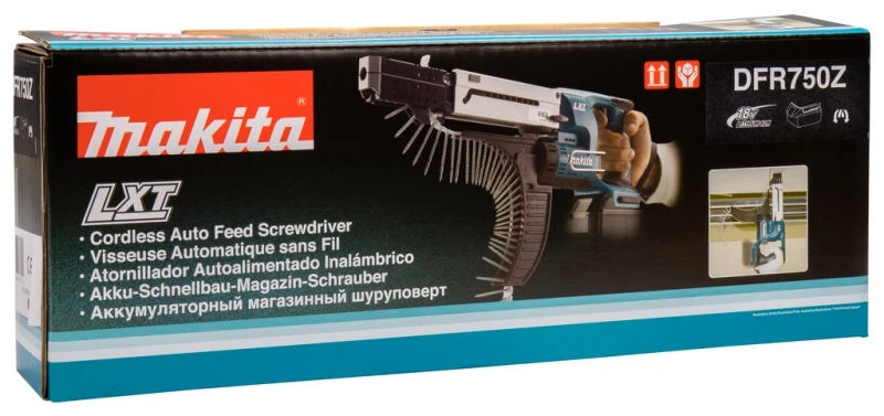 De DFR750Z is een 18 V LXT schroefautomaat voor bevestiging van gipsplaten op metalstud en hout. De machine is voorzien van een lichte en compacte 4-polige motor voor een constant toerental en draait onbelast 4.000 toeren per minuut. Hij kan schroeven verwerken van 45 mm t/m 75 mm.