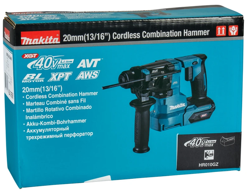 XGT 40 V Max Accu combihamer HR010GZ met SDS-PLUS opname. Geleverd zonder accu , snellader en stofafzuiging – in doos.