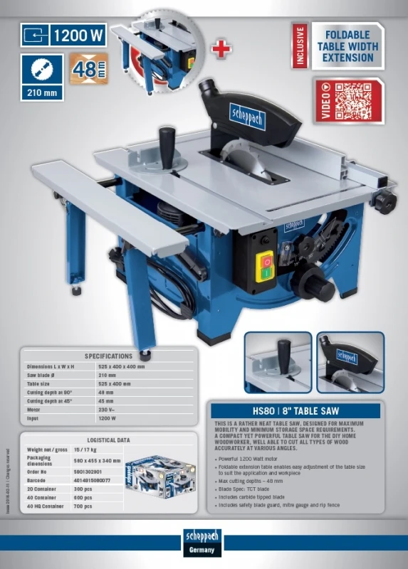Scheppach HS80 zaagtafel 8 inch. Deze zaagtafel is ontwikkeld voor maximale mobiliteit en om zo weinig mogelijk plek in te nemen bij opbergen. De tafelzaag is compact maar krachtig en geschikt voor de doe-het-zelver waarmee hij alle soorten hout accuraat kan zagen in verschillende hoeken